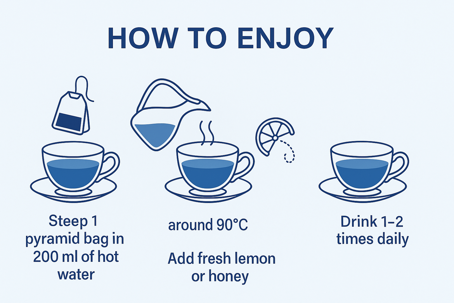To enjoy, simply steep one pyramid bag in 200ml of hot water (around 90°C) for 4–5 minutes. For enhanced benefits and a refreshing twist, add fresh lemon or honey. Drink 1–2 times daily, ideally after meals or in the afternoon to support digestion and fat metabolism. It can also be cold brewed for a convenient slimming drink on the go.