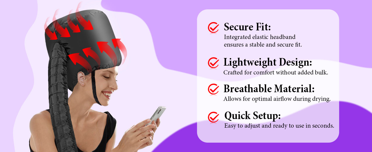 No more “one-size-fits-nobody” struggles! Our bonnet dryer has an adjustable fit that hugs all head sizes comfortably—and stays put, even when you’re folding laundry, sipping coffee, or binging your show. Multitask like a pro while your hair dries perfectly.