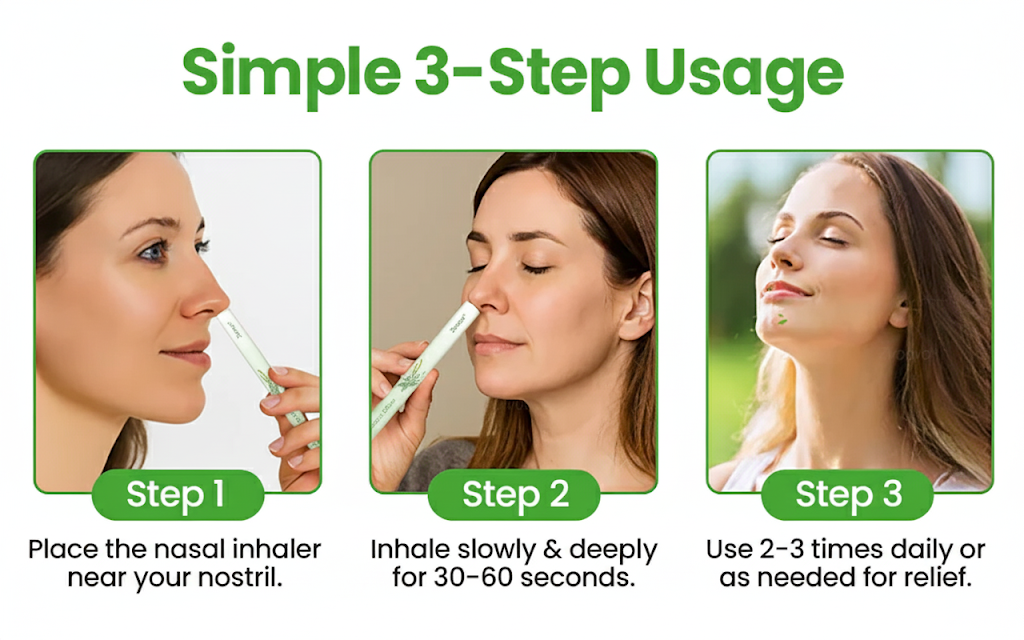 It is recommended to use 1–3 times per day as needed. Simply place the inhaler near your nostril and inhale slowly and deeply for 30–60 seconds. If you feel any discomfort, reduce the frequency.