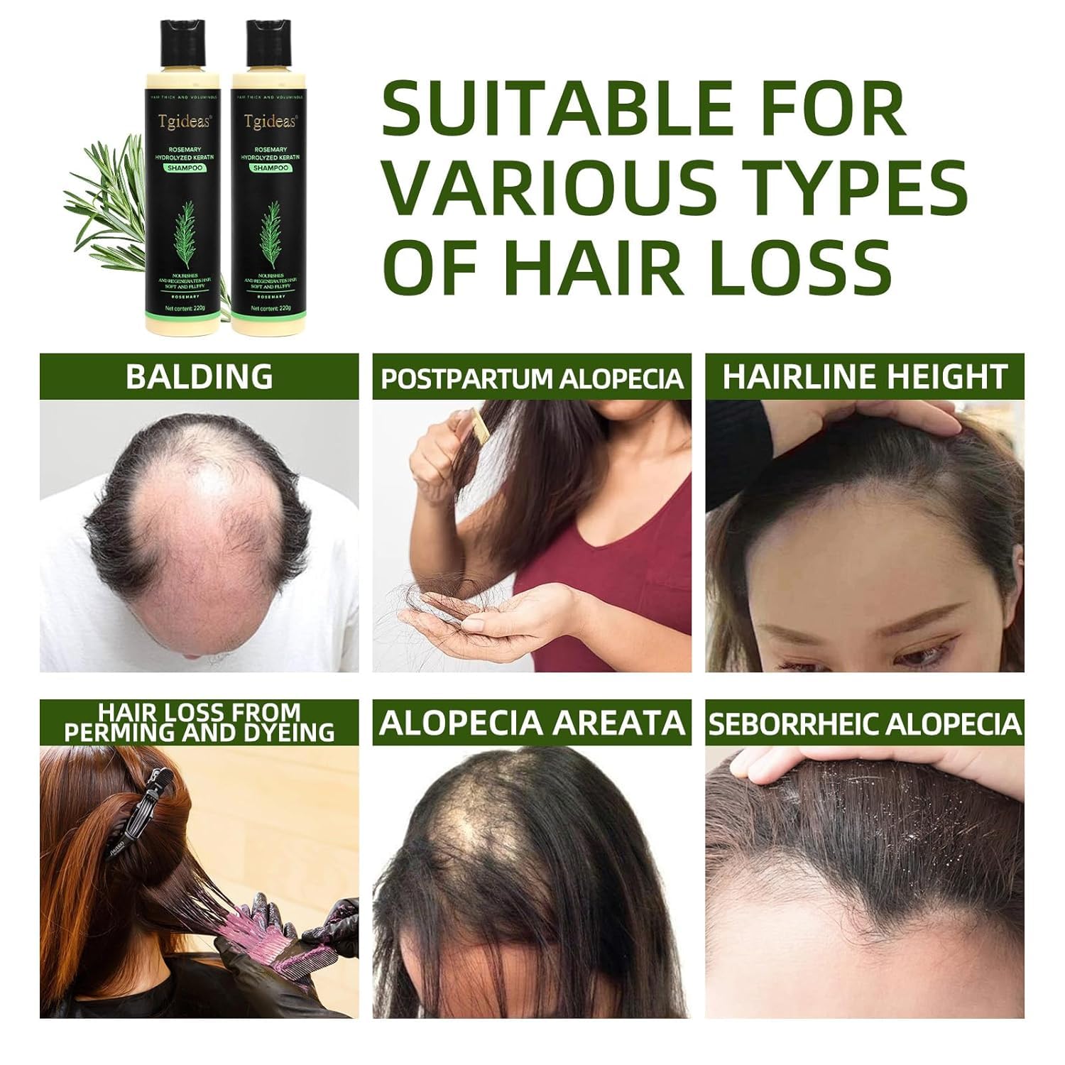 Tgideas Rosemary Hydrolyzed Keratin shampoo is expertly formulated to combat a wide range of hair loss concerns, making it a versatile solution for both men and women. Whether you're dealing with genetic balding, postpartum shedding, or are ceding hairline, this natural blend of rosemary extract and hydrolyzed keratin works to stimulate follicles, reduce breakage.and promote regrowth.It also addresses chemical-induced damage from perming and dyeing, patchy alopecia areata, and seborrheic alopecia caused by scalp imbalances-delivering up to 70% less fallout with consistent use, for thicker, healthier hair tailored to your unique needs.