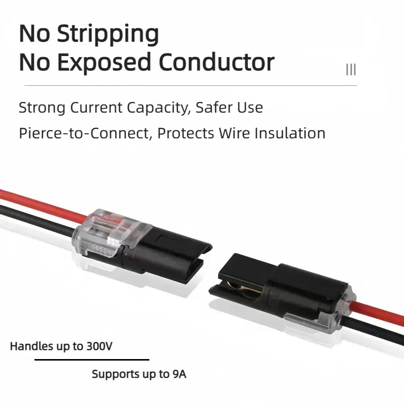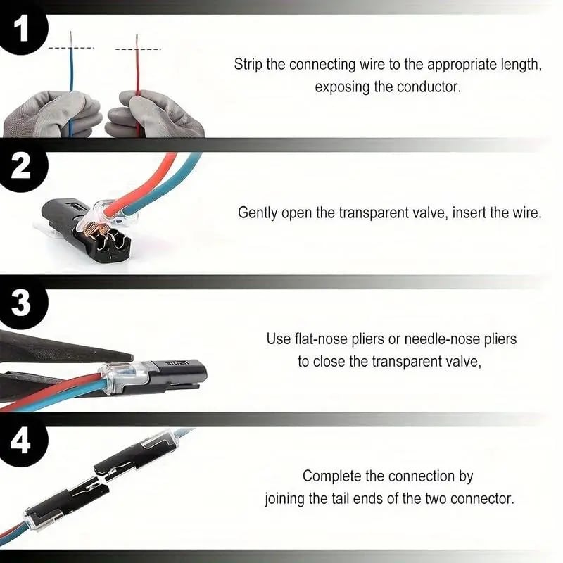 Cut wiring time by 70%! Just lift the latch, insert the wire, press the latch down — done. Test holes are built in, so you can check voltage without removing anything. Note: You’ll need two connectors (one for each wire end), then just plug them together to complete the circuit.