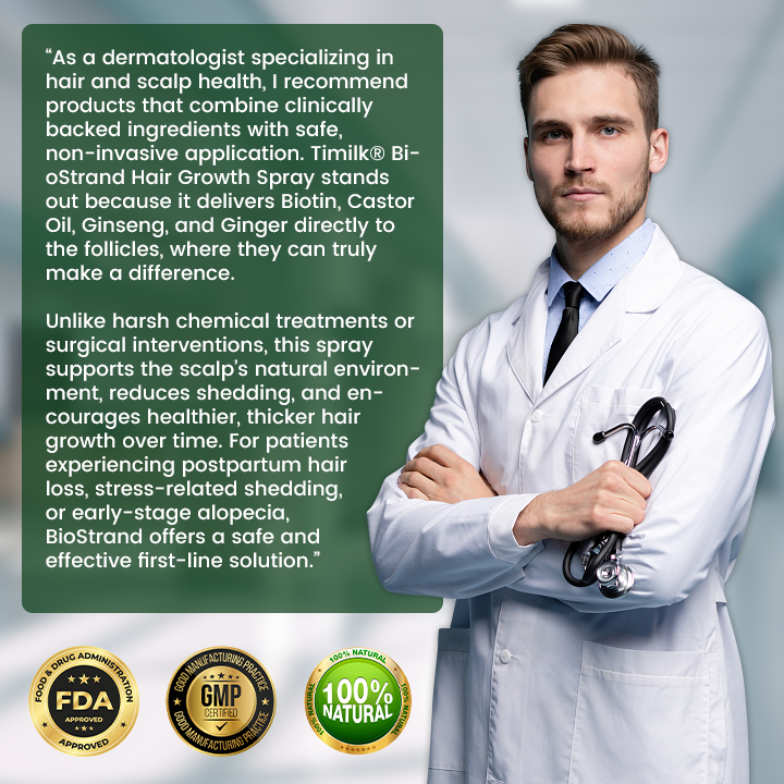 Clinically supported and dermatologist-tested, Timilk® BioStrand Hair Growth Spray nourishes the scalp and strengthens follicles, creating the ideal environment for regrowth. By enlarging follicle size and delivering oxygen-rich nutrients, it supports thicker, denser, and healthier hair. This natural formula helps combat issues like genetic hair loss, DHT-related thinning, and postpartum shedding—leaving your strands visibly stronger and revitalized with daily use.